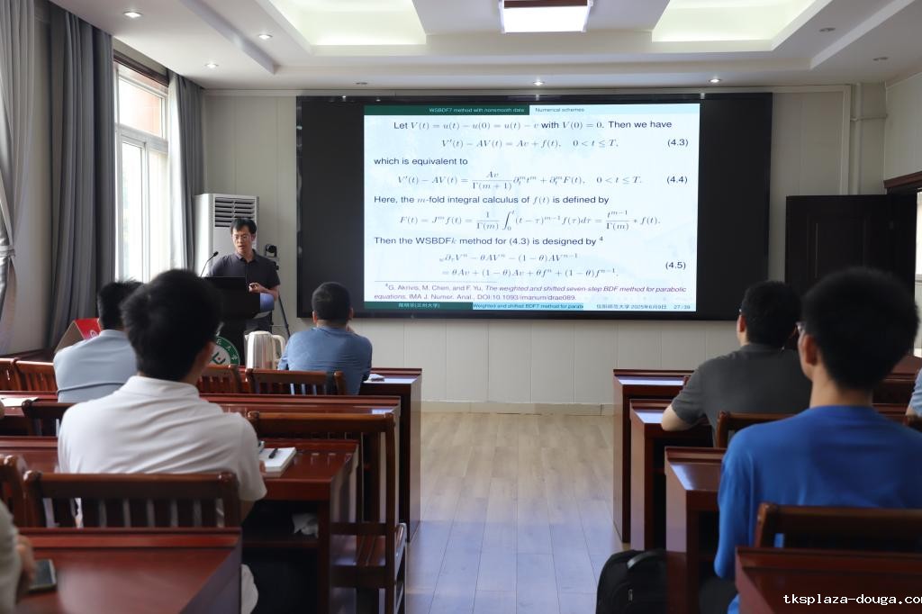 陈明华介绍了线性多步法七步法(BDF7)求解抛物型方程的稳定性,通过结合两种非零稳定格式(即七步BDF 及其移位对应格式)构造了一种具有A (α) 稳定性的新格式以及该方法求解具有非光滑数据的抛物型方程的最新成果。